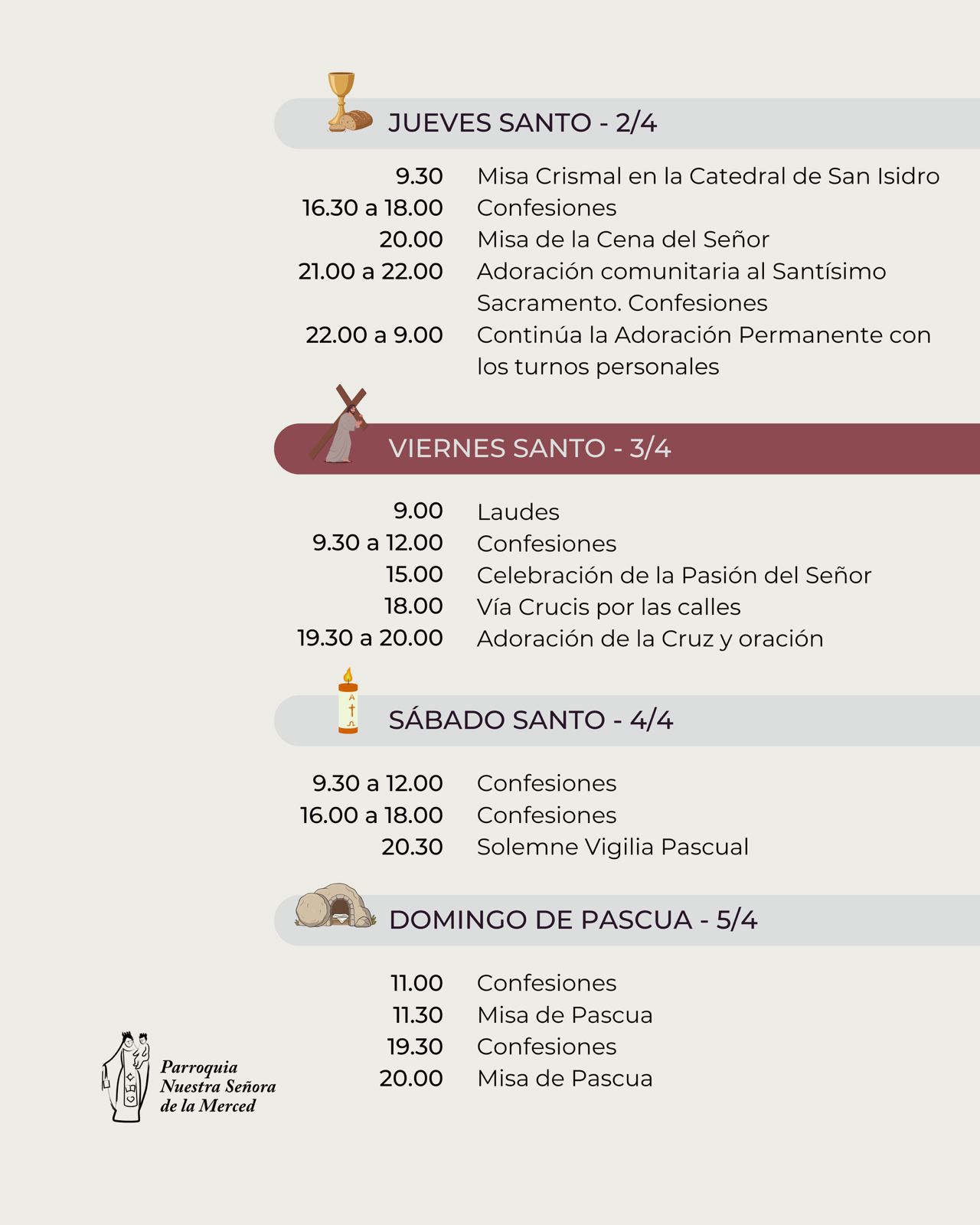 Esta Semana Santa los invitamos a juntarnos como comunidad para celebrar a Cristo ente nosotros. Este es el esquema de celebraciones en la Parroquia La Merced, en la Capilla Cristo Redentor,