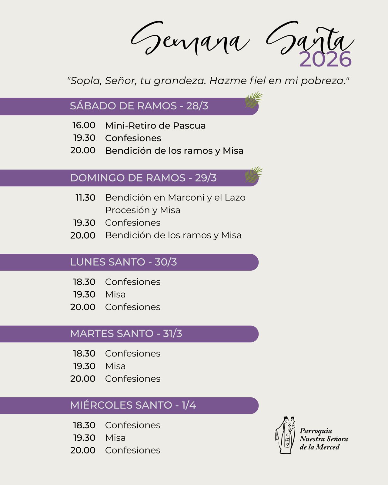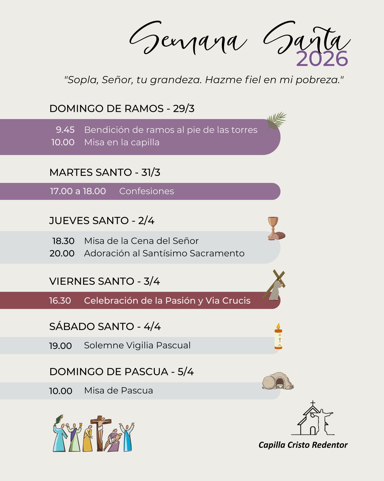 Esta Semana Santa los invitamos a juntarnos como comunidad para celebrar a Cristo ente nosotros. Este es el esquema de celebraciones en la Parroquia La Merced, en la Capilla Cristo Redentor,